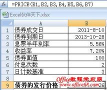 在Excel中,如果 计算债券的发行价格 ,可以使用PRICE函数计算债券的发行价格。Excel2007可使用PRICE函数计算债券的发行价格。 如上图所示,在B9单元格输入公式: =PRICE(B1,B2,B3,B4,B5,B6,B7) 按回车键即可计算债券的发行价格。返回债券的发行价格。 Excel2007可使用PRICE函数计算债券的发行价格。 相关说明: PRICE函数...