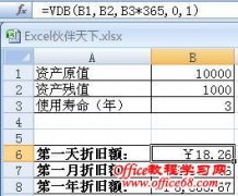 在Excel中,如果按 可变余额递减法计算固定资产折旧额 ,可以使用VDB函数按可变余额递减法计算固定资产折旧额。Excel2007可使用VDB函数按可变余额递减法计算固定资产折旧额。 如上图所示,在B6单元格输入公式: =VDB(B1,B2,B3*365,0,1) 按回车键即可按可变余额递减法计算固定资产折旧额。返回按可变余额递减法计算第一天固...