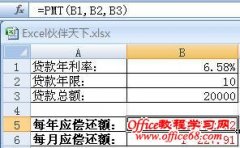 在Excel中,如果 计算贷款每期应偿还额 ,可以使用PMT函数计算贷款每期应偿还额。Excel2007可使用PMT函数计算贷款每期应偿还额。 如上图所示,在B5单元格输入公式: =PMT(B1,B2,B3) 按回车键即可计算贷款每期应偿还额。返回贷款每年应偿还额。 在B6单元格输入公式: =PMT(B1/12,B2*12,B3) 按回车键即可计算贷款每期应偿还...