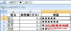 在Excel中,如果要对员工的销售额 标明等级 ,可以使用REPT函数标明等级。Excel2007可使用REPT函数标明等级。 如上图所示,在C2单元格输入公式: =REPT(★,B2/1) 按回车键即可标明等级,根据不同的销售显示一定的★符号,显示不同的等级。 Excel2007可使用REPT函数标明等级。 相关说明: REPT函数语法:REPT(text,number_t...