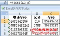 在Excel中,如果要 拆分电话号码 ,将电话号码中的区号和号码分隔开来,可以使用RIGHT函数拆分电话号码。Excel2007可使用RIGHT函数拆分电话号码。 如上图所示,在B2单元格输入公式: =LEFT(A2,LEN(A2)-8) 在C2单元格输入公式: =RIGHT(A2,8) 按回车键即可拆分电话号码,返回按区号和号码分隔后的电话号码。 Excel2007可使...