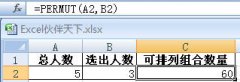 在Excel中,如果从5名学生中选出3名学生参加竞赛,需要 计算数据的排列数 ,可以使用PERMUT函数计算数据的排列数。Excel2007可使用PERMUT函数计算数据的排列数。 如上图所示,在C2单元格输入公式: =PERMUT(A2,B2) 按回车键即可计算数据的排列数。返回如果从5名学生中选出3名学生参加竞赛的所有可能组合数。 Excel2007可使...