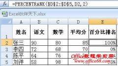 在 Excel 中,使用RANK函数 根据学生成绩进行排名 。如果要 计算百分比排名 ,可以使用PERCENTRANK函数计算百分比排名。 Excel2007 可使用PERCENTRANK函数计算百分比排名。 如上图所示,在E2单元格输入公式: =PERCENTRANK($D$2:$D$5,D2,2) 按回车键即可计算百分比排名。返回学生成绩的百分比排名。 Excel2007可使用PERCEN...