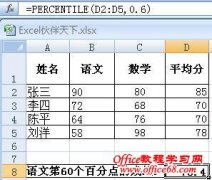 在Excel中,如果要 计算指定百分点的值 ,可以使用PERCENTILE函数计算指定百分点的值。Excel2007可使用PERCENTILE函数计算指定百分点的值。 如上图所示,在D8单元格输入公式: =PERCENTILE(D2:D5,0.6) 按回车键即可计算指定百分点的值。返回学生成绩的百分比排名。 Excel2007可使用PERCENTILE函数计算指定百分点的值。 相...