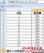 在Excel中,如果根据趋势需要 预测下个月的销售额 ,可以使用TREND函数预测下个月的销售额。Excel2007可使用TREND函数预测下个月的销售额。 如上图所示,在B14单元格输入公式: =TREND(B2:B12,A2:A12,12) 按回车键即可预测下个月的销售额。返回预计12月份的销售额。 Excel2007可使用TREND函数预测下个月的销售额。 相关说...