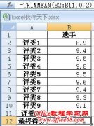 在Excel中,在某项比赛中,共有10位评委打分,需要去掉一个最高分、去掉一个最低分,计算最后得分,可以使用TRIMMEAN函数 计算内部平均值 。Excel2007可使用TRIMMEAN函数计算内部平均值。 如上图所示,在B11单元格输入公式: =TRIMMEAN(B2:B11,0.2) 按回车键即可计算内部平均值。返回去掉一个最高分、去掉一个最低分后的最...