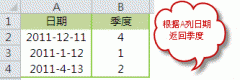 文章解释excel返回季度的五种公式写法,都可以返回日期对应季度。 下面是excel返回季度的一个公式用法总结,如下图所示,根据A列的日期,返回对应的季度。 excel返回季度公式一: =ROUNDUP(MONTH(A2)/3,0) 解释:MONTH(A2),结果为12。MONTH函数的用法是返回日期中的月份,它是介于 1(一月)和12(十二月)之间的整数。 MONTH...