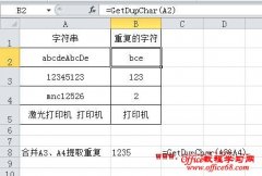 有时需要将Excel单元格内字符串中的重复字符提取出来,例如提取字符串abcdeAbcDe中重复的几个字符bce,如图所示,可以用自定义函数实现。 1.按Alt+F11,打开VBA编辑器。 2.单击菜单插入模块,在代码窗口中粘贴代码: Function GetDupChar(theString As String) As String Dim i As Integer For i = 1 To Len(theString) -...