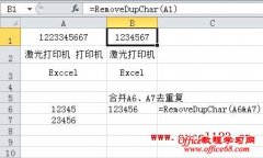 如果要在Excel中将单元格内字符串中的重复字符去掉,重复的字符仅保留一个,如将字符串1232345667变成1234567,可以用自定义函数实现。 步骤如下: 1.按Alt+F11,打开VBA编辑器。 2.单击菜单插入模块,在代码窗口中粘贴代码: Function RemoveDupChar(theString As String) As String Dim i As Integer For i = 1 To Len(t...