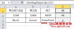 要在Excel中获取区域内各单元格字符串中的相同字符, 可用下面的自定义函数。例如要在D1单元格获取A1:C1区域各单元格中相同的字符,如图: 按Alt+F11,打开VBA编辑器,单击菜单插入模块,在代码窗口中输入自定义函数: Function GetDupChars(rRng As Range) As String Application.Volatile Dim i As Integer, j As Intege...