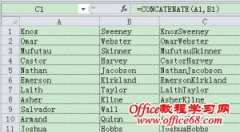 我们通常都使用函数CONCATENATE合并两列数据。只要在目标单元格(假设是C1)中输入=CONCATENATE(A1,B1),就可以把A2与B2两个单元格内的数据合并到一个单元格中,但这种合并的结果是将原单元格内容无间隙合并的,即结果是两组数据粘在一起了,没有分隔开来,如这样的一组外国人名数据: A列和B列为原数据,C列为合并单元格后...
