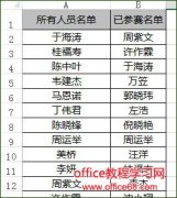 countif函数的实际运用小案例。 左边A列是所有人员名单,B列是从A列中抽出来参数名单。现在的问题参赛人员还不够,还需要继续从A列名单中,抽取一些人员出来参赛。 问题:Excel怎么知道哪些人已经参赛了,A列中还有哪些人没有参赛,可以抽出来。Excel为我们准备了这样的函数哈,它就是COUNTIF函数。 我们用C列做辅助列,C2...