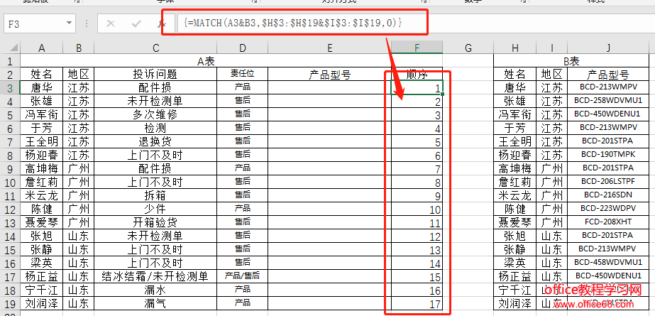 完成多条件查询第一步先要确定A表中姓名&地区合并后对应在B表中姓名&地区的顺序。这里我们通过MATCH来完成,我们用个简单的例子说明。