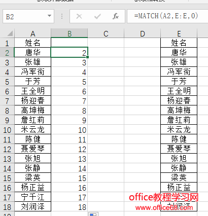 ![]() =MATCH(A2,E:E,0)表示使用A2单元格在E列中查找,0表示精确查找、1小于、-1大于,通常情况下都是精确查找。