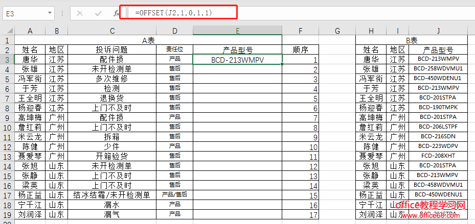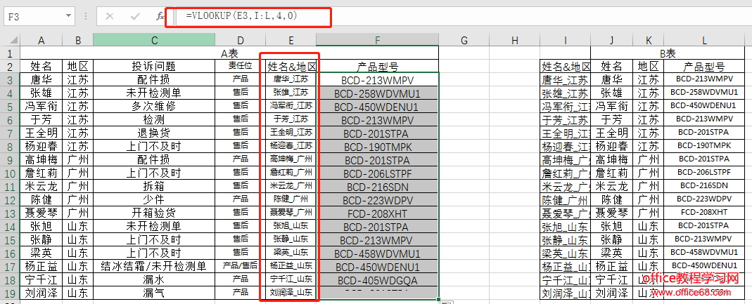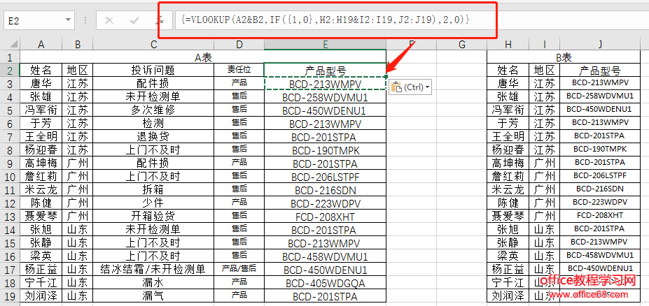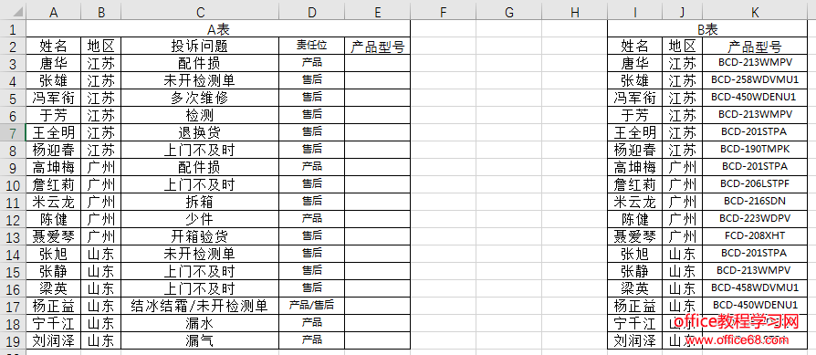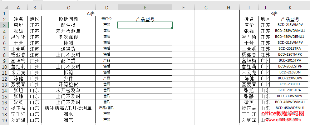 下表是某电商公司的客户投诉表,现在需要通过A表中的客户姓名与地区两个条件来查询B表中的产品型号,返回到A表的E列中。
