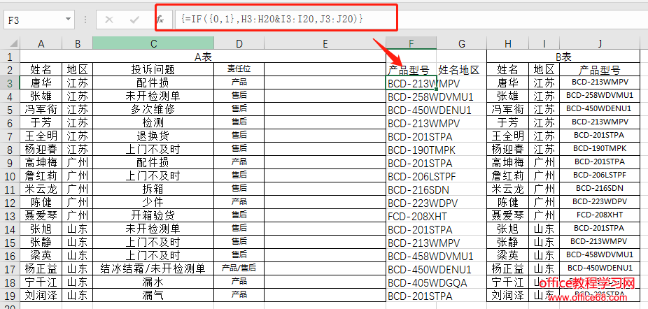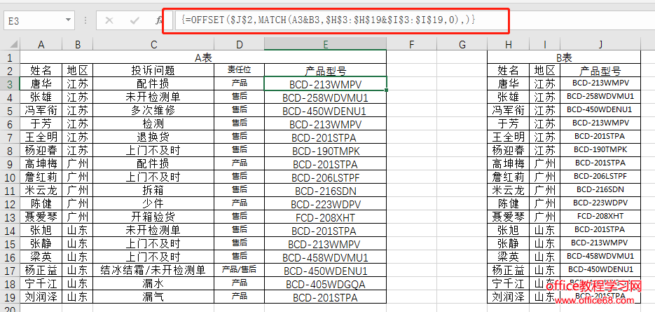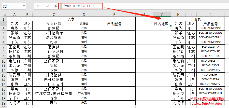 还以客户投诉表为例,按照姓名&地区来匹配产品型号返回到E里中。