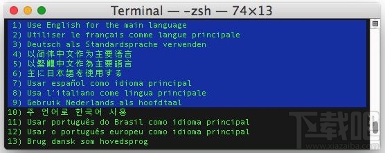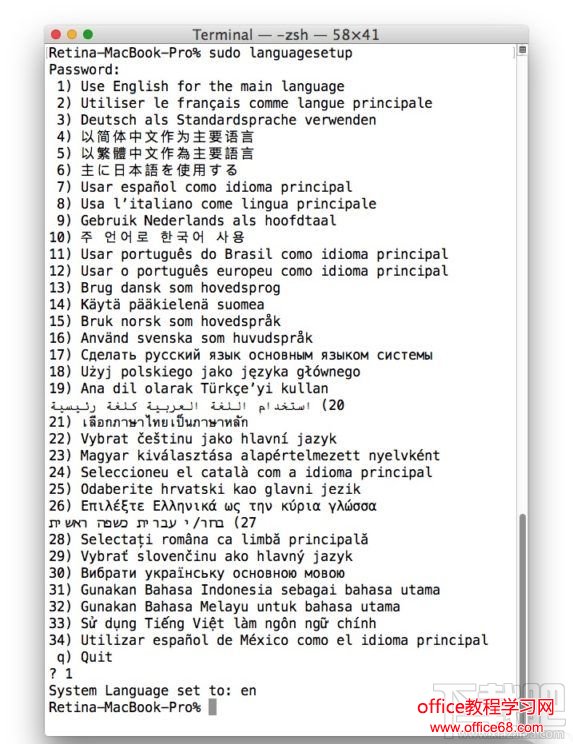 1.首先运行终端 2.然后输入下列指令并点击回车 sudo languagesetup 3.输入要设置语言的对应数字,例如 1 对应的是英语,4 对应的是简体中文,5 对应繁体中文,6 对应日语等,然后点击回车(详情可查看下图的各国语言列表所对应的数字)