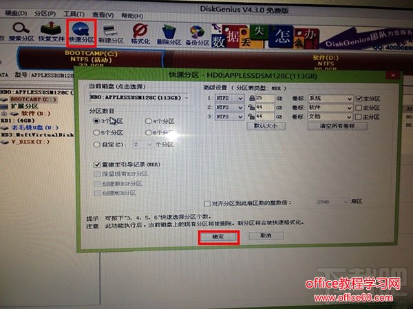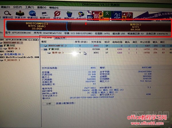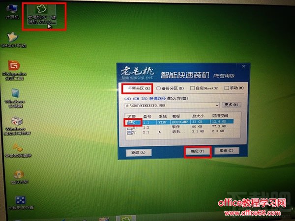 根据你自己的需要对硬盘进行分区,格式建议还是选择NTFS格式,以后会省去很多的麻烦!由于我的是120的AIR,所以我只是分了两个区,一个33,一个80,如果你是500的MACBOOK PRO,那就可以多分两个区了。 分好之后,确定,等他跑,跑完了之后关掉分区工具就可以了。 然后你现在再打开“我的电脑”,看看是不是按照你选的那样,已经分区成功了,如果没有,重复做上面的动作,一定是哪个地方点错了,不管他提示你什么,选择“是”就对了。 现在你再来“打开老毛桃PE一键装机”,如下图: