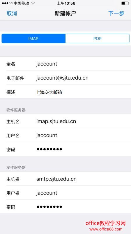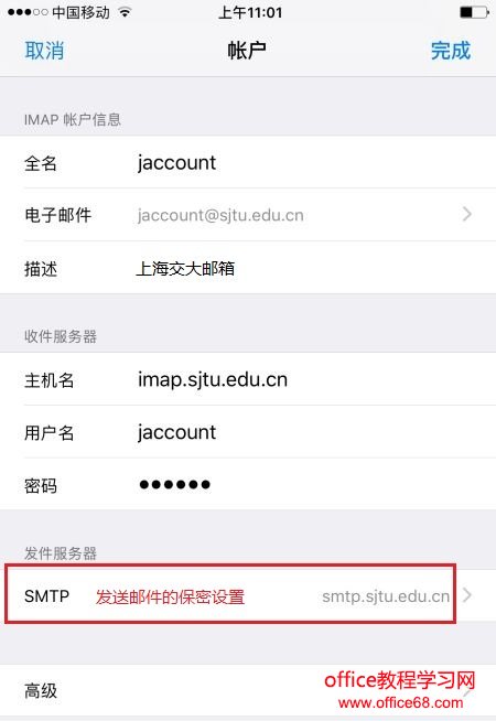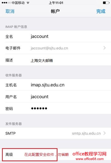 下图以IOS 10.2 版本制作,演示iphone 如何通过内置邮件应用安全访问学校邮件服务器。 如果您希望使用第三方的应用程序访问邮箱,请务必确认该应用程序支持SSL/TLS方式的访问; 我们不建议使用STARTTLS方式访问邮箱,该方式存在已知的安全问题。