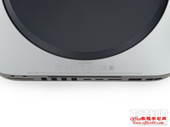 ▲Mac mini的背面接口布局基本上同前代相同,唯一的改变的就是取消了FireWire端口,并增加了Thunderbolt 2端口。顶部角上印有型号A1347.