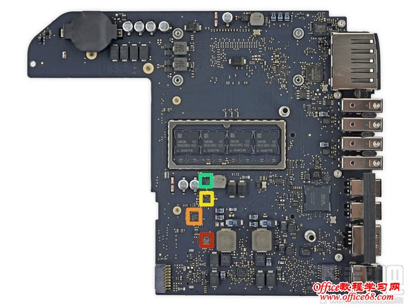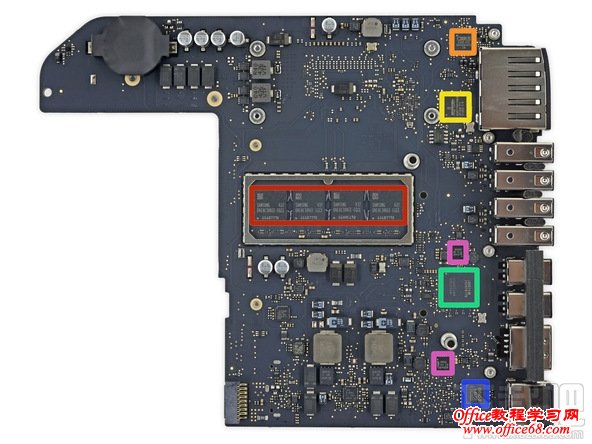 ● 红色:三星K4E8E304EE-EGCE 8 Gb LPDDR3(8 Gb x 4 = 32 Gb = 4 GB),内存焊接在主板上,这就意味着如果要升级,你需要购买更高规格Mac mini。