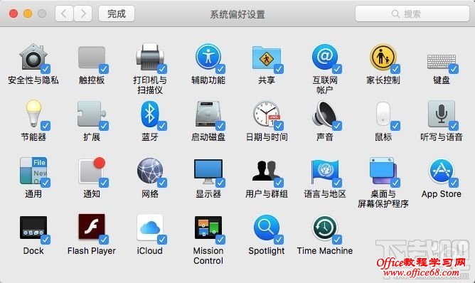 3.打钩的图标将会显示在系统偏好设置的面板上,要隐藏某个图标,取消选定对应图标即可 当然,隐藏图标并不等于删除了这个系统设置,你依然可以通过系统偏好设置中的内置搜索来搜索隐藏了的选项。