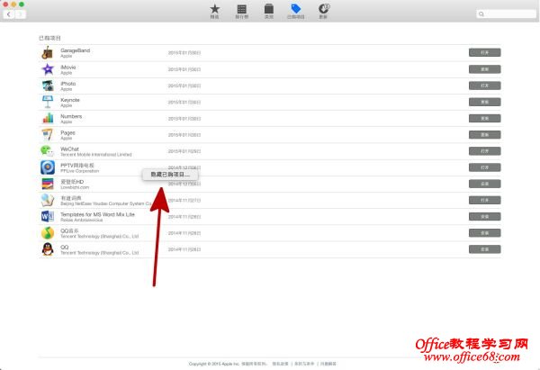 4.找到你希望隐藏的应用,右键点击该应用,点击隐藏已购项目,确认即可