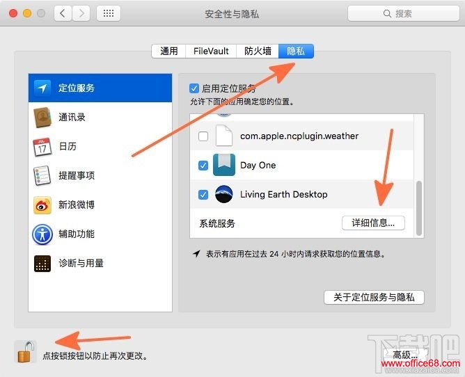 2.点击“隐私”-“定位服务”,在“启用定位服务”下向下拉,点击“详细信息”(注意:要先点击左下角的按钮锁解锁)