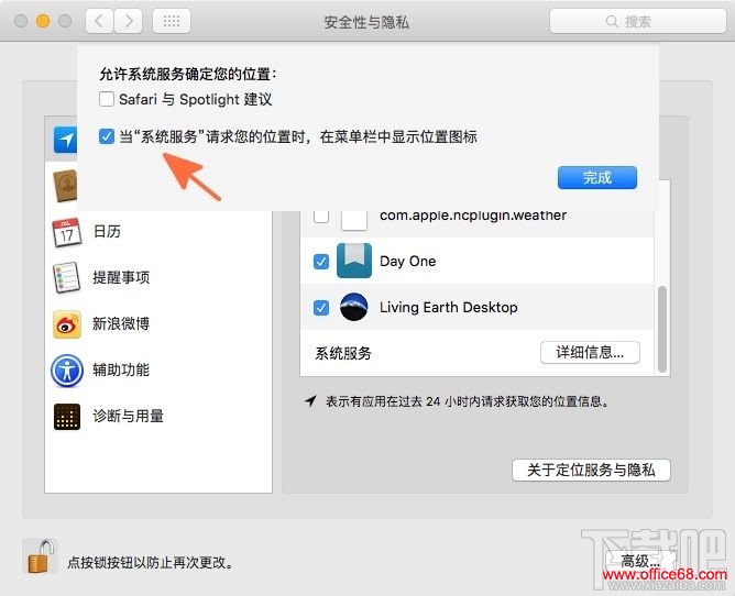3.在弹出框中勾选:当“系统服务”请求您的位置时,在菜单栏中显示位置图标,并点击完成。