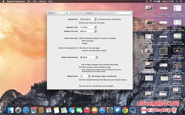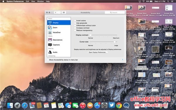 Yosemite提供了包括文字大小、显示屏对比度以及其他视图等多种选择。Yosemite提供了许多可以调整的设置,不管是屏幕的显示方式,或是视觉或听觉上调整,还能调节菜单栏的透明度、显示屏的对比度、文本的大小和光标的大小。 录制苹果设备的屏幕