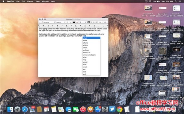 Yosemite能把iOS设备的屏幕录制为视频文件。通过闪电接口把iOS设备插到Mac上,打开QuickTime,然后打开文件>视频录制。这个功能可用于捕捉一些游戏动作,向朋友或家人分享如何在设备上调整设置,或者记录机器的故障。 QuickType自动预测