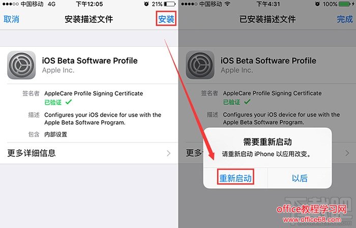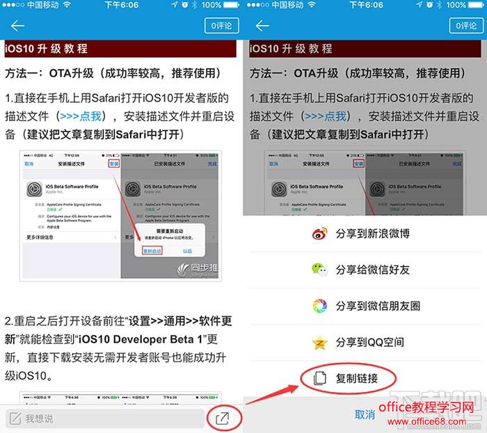 OTA升级(成功率较高,推荐使用) 1.直接在手机上用Safari打开iOS10开发者版的描述文件,安装描述文件并重启设备(建议把文章复制到Safari中打开)