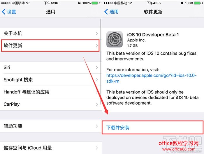2.重启之后打开设备前往“设置>>通用>>软件更新”就能检查到“iOS10 Developer Beta 1”更新,直接下载安装无需开发者账号也能成功升级iOS10。