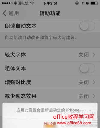 3、手机自动重启,打开选项之后,系统会弹出一个关于重启设备的咨询窗口,点击“继续”即可!