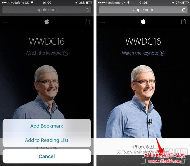 另外,你还可以通过简单的步骤来将任何网页添加到书签或阅读列表中。用户只需点击并长按底部菜单的书签按钮,Safari 便会弹出“添加书签”和“添加到阅读列表”的选项,选择任一选项即可执行相关操作。 |