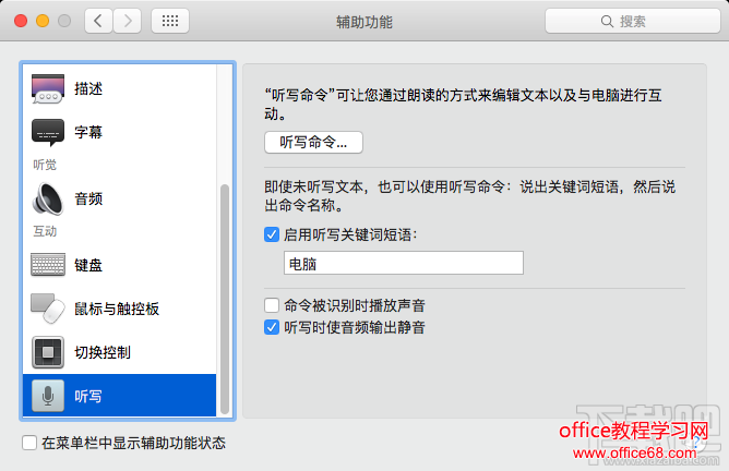 步骤三:打开系统偏好设置 - 辅助功能 - 听写,勾选“启用听写关键词短语”这一选项。关键词短语默认为“电脑”,我们可以把它改成我们想要的任何文字。 步骤四:对着设备说“电脑开始听写”就能启用免提听写功能,使用完了之后说“电脑停止听写”就能够关闭功能。 |