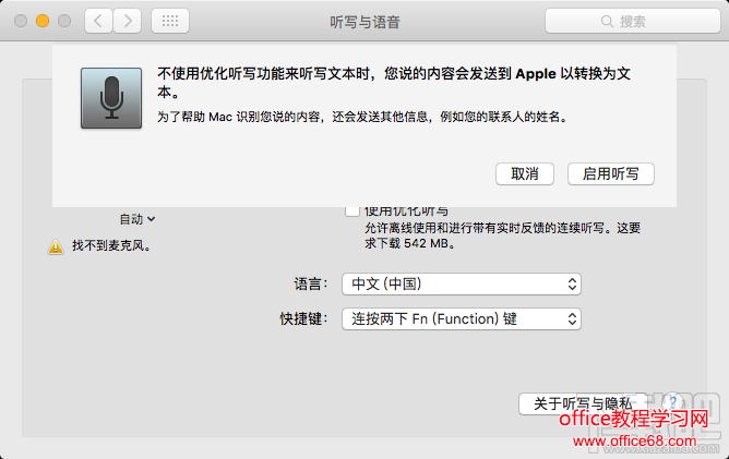 步骤二:勾选“使用优化听写”选项,这时候系统将会下载一个 542MB 的文件,以实现离线使用和进行带有实时反馈的听写,否则我们说话的内容将会发送到 Apple 才能转换成文本。