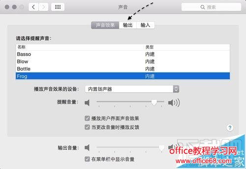 3、接下来请在声音设置窗口中点击“输出” 一栏,如下图所示