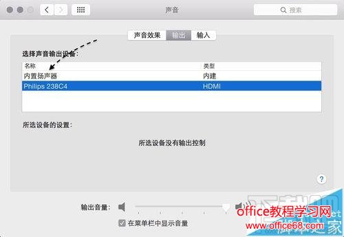 4、随后请确认当前声音输出设备是否有多个,比如我这里外接了一个 HDMI 的显示器,可以输出声音。如果在你的 Mac 上也有多个输出设备的话,请选择“内置扬声器” 一栏,即 Mac 自带的喇叭。