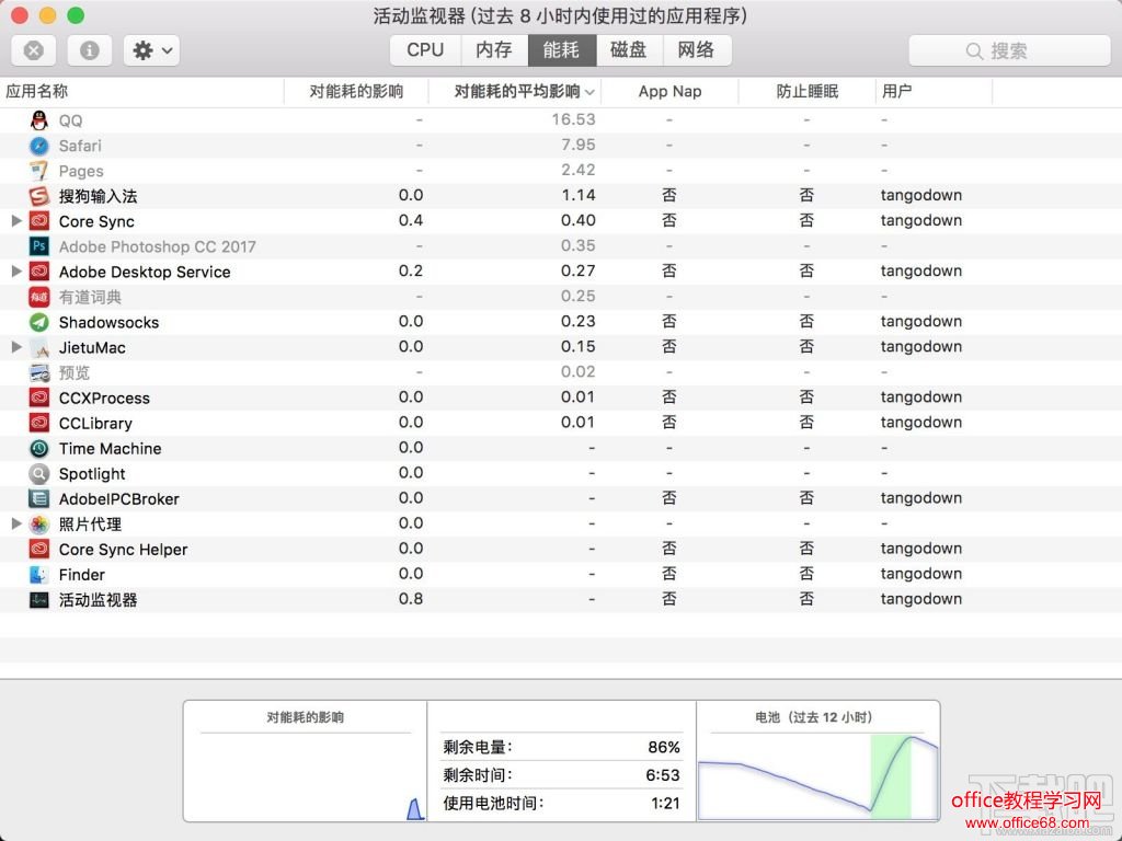 在“活动监视器”窗口的顶部选择“能耗”标签,即可在窗口底部看到“剩余电量”、“剩余时间”以及“使用电池时间”这三个信息。