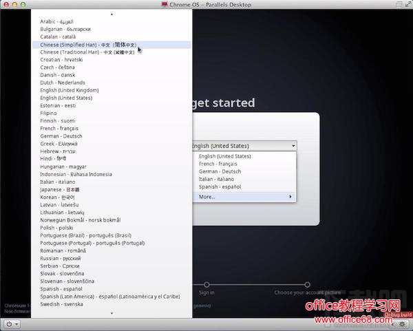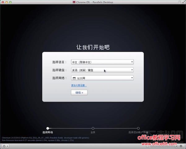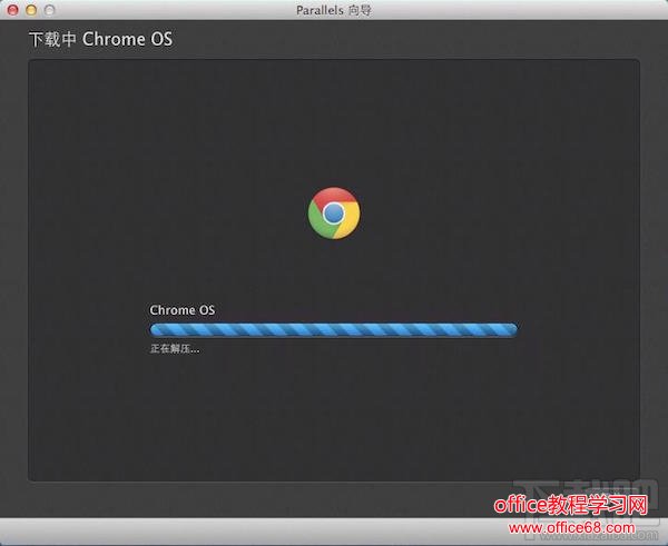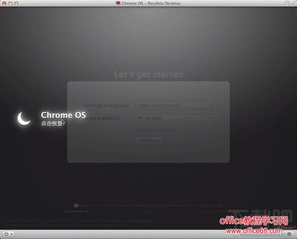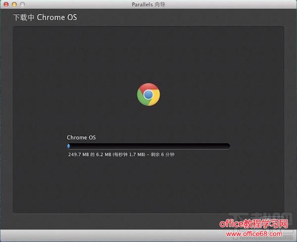 2、在Parallels新建虚拟机向导中“下载 Chrome OS”,点击继续。自动进入Chrome OS 下载,下载完成后自动解压,解压完成后,点击“电源”图标启动Chrome OS安装设置。