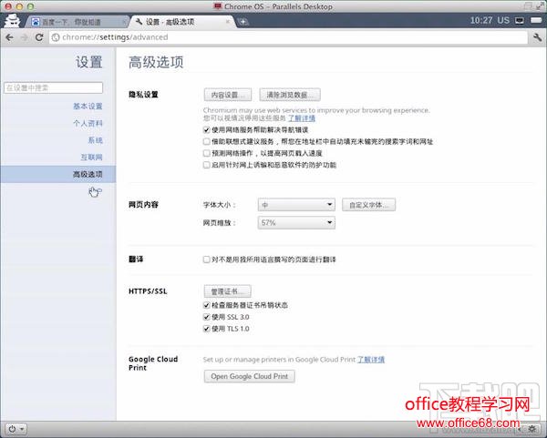 4、通过右上角的设置按钮,即可来设置Chrome OS系统。Chrome OS系统与我们平常使用的Chrome 浏览器基本没有差异,可以看做是一个放大版的Chrome 浏览器,设置也与之相同,不再叙述。