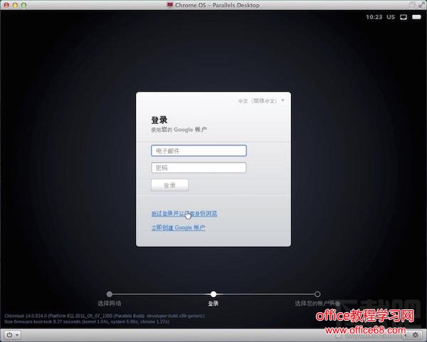 3、“点击恢复”进入虚拟机配置。包括设定虚拟机的语言键盘等。设定成功完成后,进入系统初始界面——“Google账户登陆”。在此界面中,Chrome OS 提供直接登陆、访客会话、及创建用户选项,根据需求自定即可。