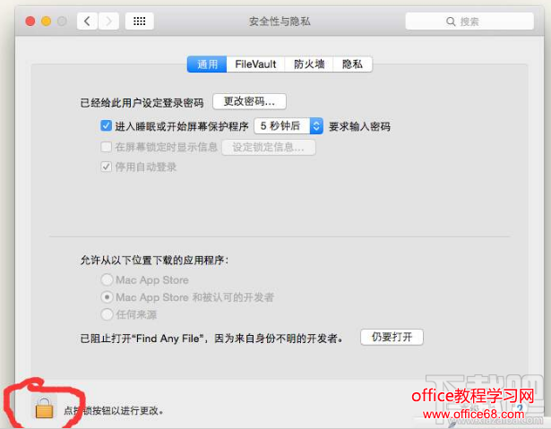 在苹果菜单中打开系统预置,点击安全性与隐私。点击界面左下方的“点按锁按钮以进行更改”。