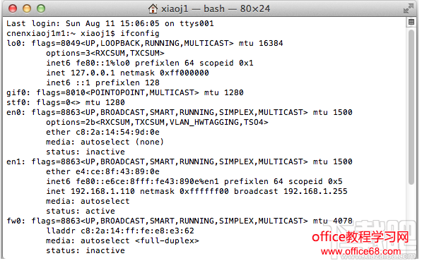 苹果MAC如何获取MAC的IP地址,很多苹果不知道怎么找,怎么查询。其实很简单的跟windows的系统是一样的启动Terminal,在输入命令行“ifconfig“即可。 苹果MAC如何获取MAC的IP地址:启动Terminal, 输入命令 "ifconfig"