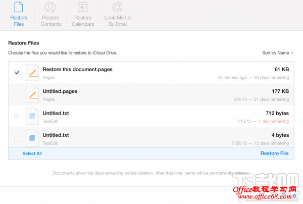 对于新增功能以下几种情况可以派上用场: 1、意外删除联系人; 2、第三方应用的bug导致iCloud日历数据被删除; 3、iCloud数据损坏(虽然很少发生,但是不排除可能性)。 一、恢复文件 选择要恢复的文件并点击“恢复文件”即可。该文件便会马上被添加到iCloud Drive中。但是有一点需要注意的是文件恢复功能之保存最近30天内删除的所有iCloud文件,30天过后,这些文件就会被永久删除。