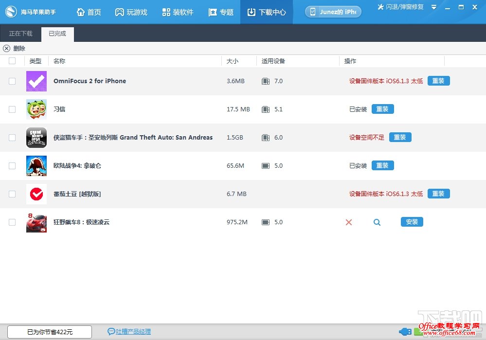 没有达到这个软件的对系统的要求。比如《里奥的宝藏》要求设备为ios7以上。