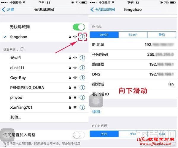 2、点击你链接WIFI后面的感叹号,然后向下滑动。