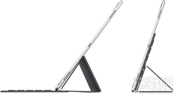 3、两种支架模式 将键盘放在iPad Pro前面,转轴处放置到键盘上的磁性凹槽,保护壳之后的部分折成三角形即可形成正常的输入模式;将键盘放置到iPad Pro后面,然后将保护壳其余部分反向折成三角形,之后再将iPad Pro向后折起即可形成方便欣赏视频的观看模式。