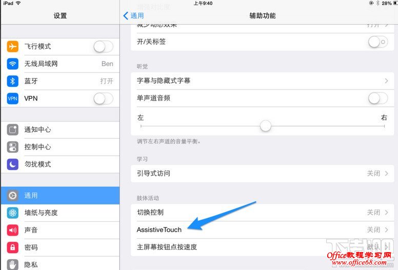 在设置列表中点击“通用”一栏,然后在右窗格中点击“辅助功能”选项
